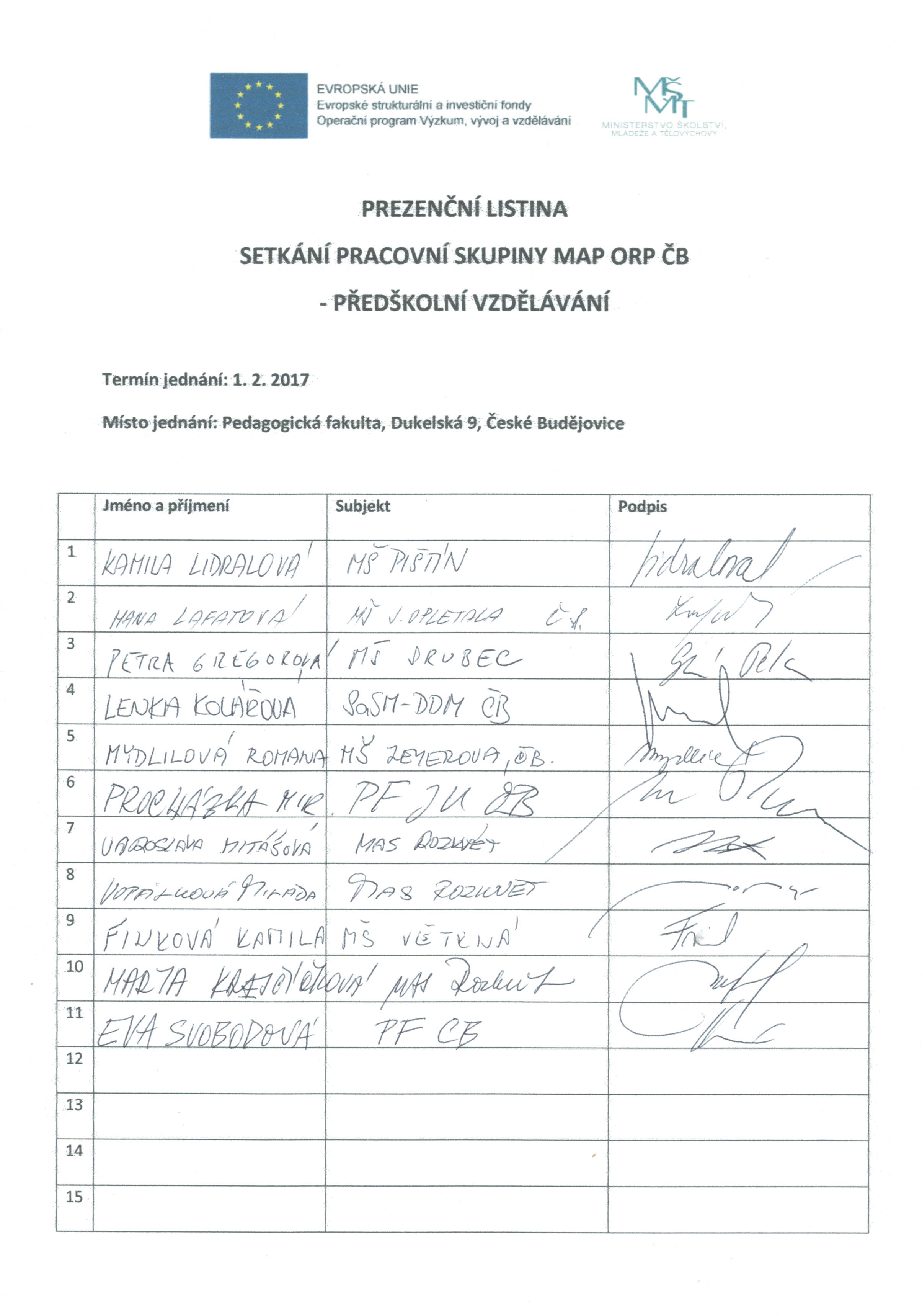 - 1.2.2017, Pedagogická fakulta JČU v Č. Budějovicích, Zápis, Prezenční listina