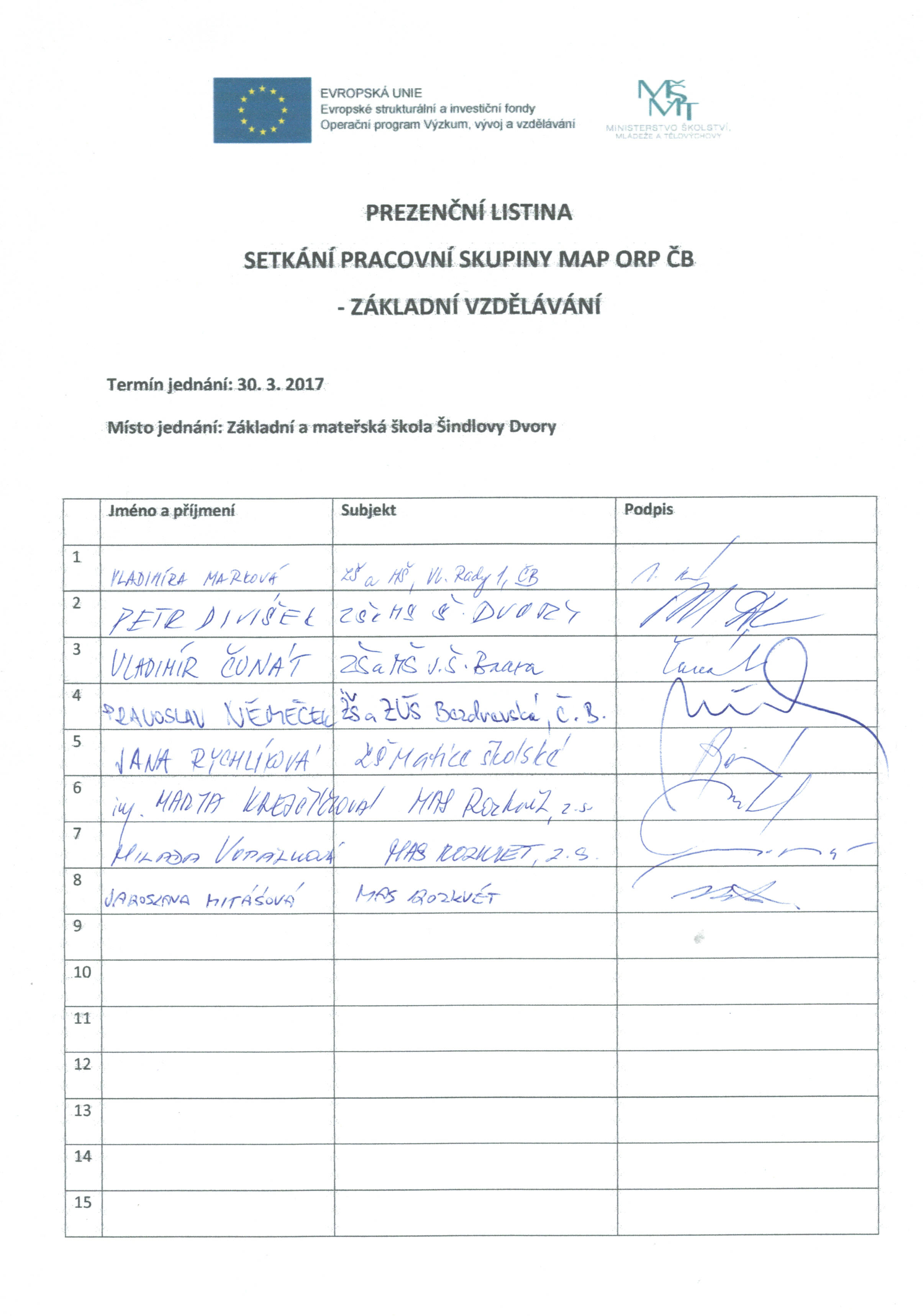 - splečné setkání členů všech pracovních skupin dne 6.2.2018 od 15 hodin na ZŠ a ZUŠ Bezdrevská 3, České Budějovice; prezenční listina