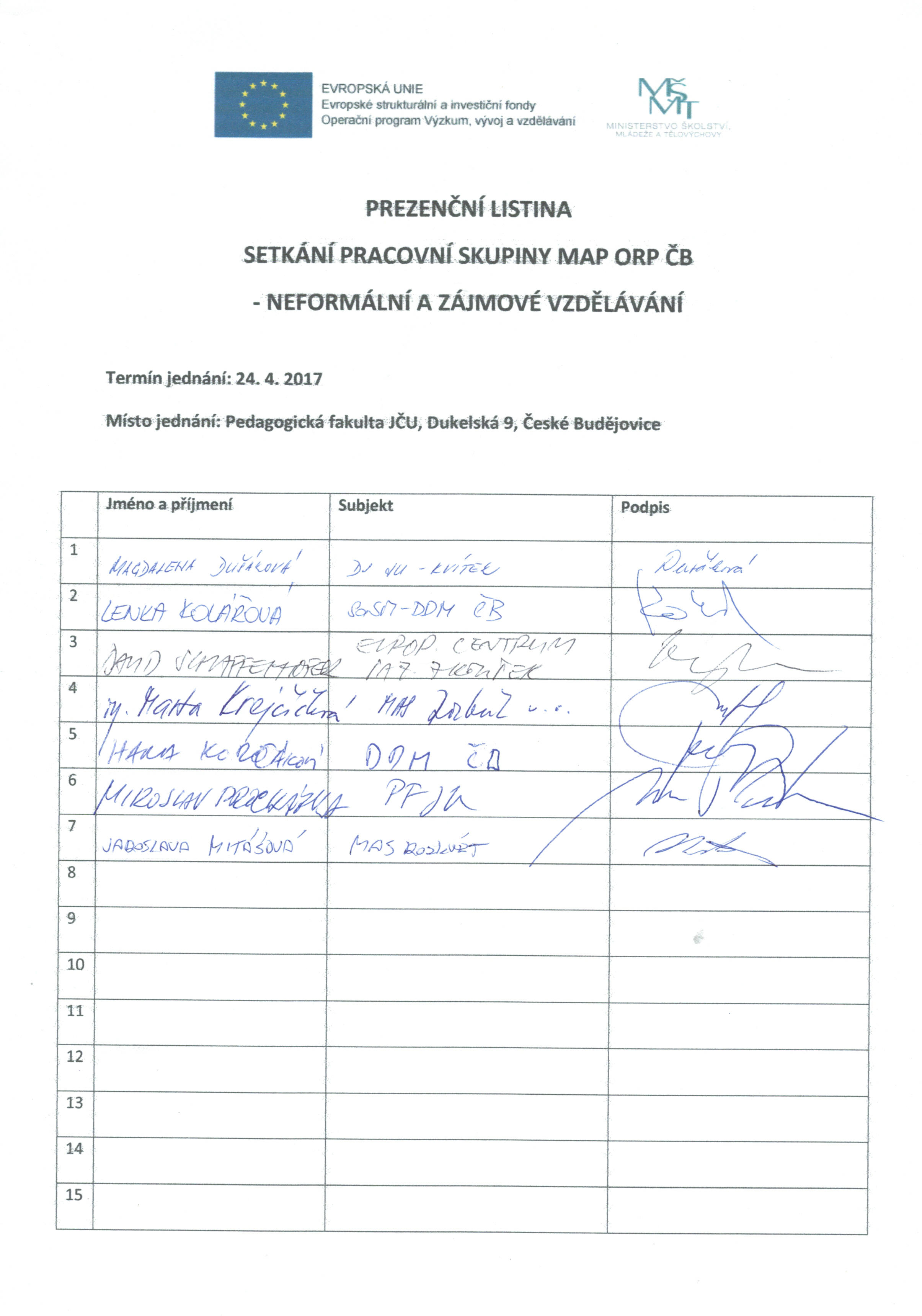 - 24.4.2017, Pedagogická fakulta JČU v Č. Budějovicích, Zápis z jednání, Prezenční listina