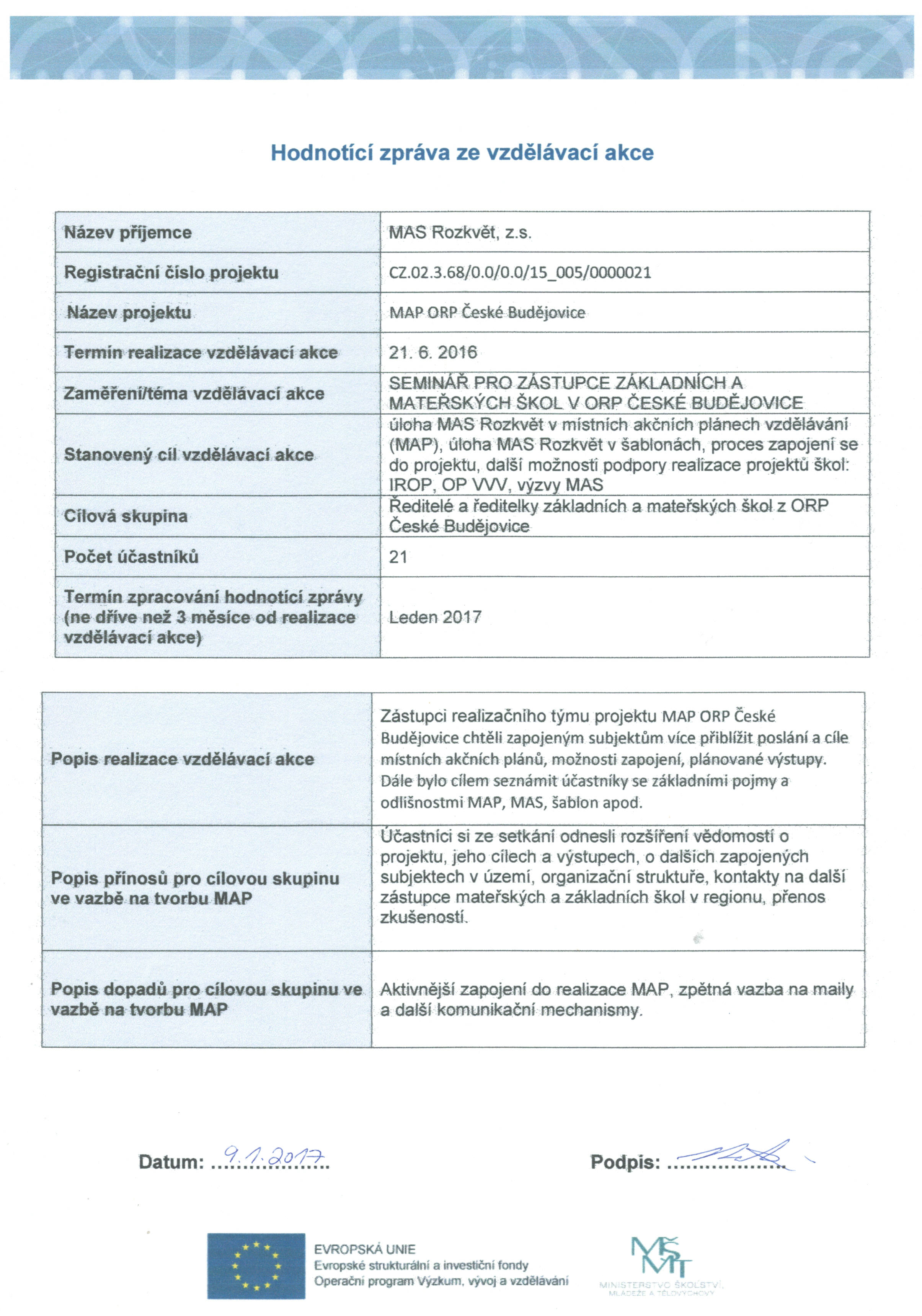 - 21.6.2016: Pozvánka na Seminář pro školy, Plástovice; prezenční listina, hodnotící zpráva
