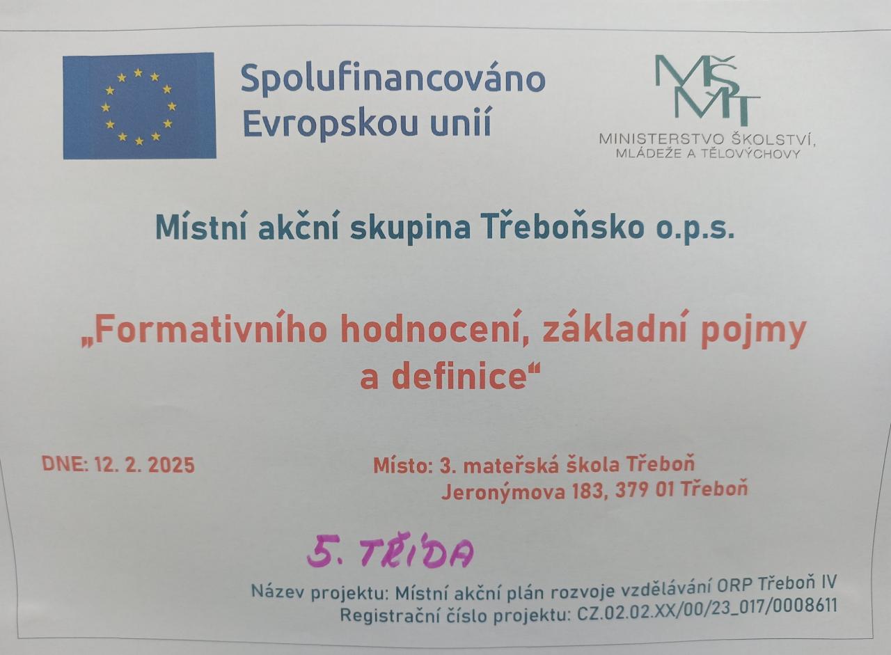 Pro velký zájem byl v Třeboni opět zahájen cyklus seminářů zaměřených na formativní hodnocení v mateřských školách. Tento cyklus pedagogům poskytuje širší pohled na daný přístup v globálním kontextu. Formativní hodnocení pomáhá dětem lépe poznat sebe sama, přijímat své pokroky i chyby a aktivně se zapojovat do učení, čímž podporuje jejich vztah k celoživotnímu vzdělávání.